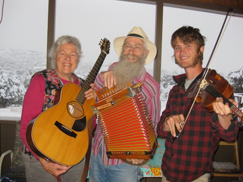 So, Ken, Jeanie and Tomás, their 22 year old punk musician godson, spoke to me and everyone, old and young, big and small, in Garway Village Hall as they took us on a journey through the flesh-eating swamps of Louisiana, hill-billy country in the Appalachians and the hot, sweaty world of New Mexico. Bayou Seco’s trick is to cock a Cajun fiddle-banjo-guitar-harmonica snook to the darker side of life, whether it’s domestic angst or lost love or being chased by a bear and eaten in the forest. And when the bear is Ken with his long, grey beard tucked up behind his glasses, then you have to laugh as you dance with him and his crazy Appalachian feet. Young Tomás held us in his handsome gaze as voice and fiddle cast their seductively un-punk spell and Jeanie held all together what could have spilled around a bit (like Momma in the kitchen), as I suspect she does in ‘most everything. The three Silver City folk swung us in the palms of their harmonious hands and took us with them to a hotter, sweeter, wilder and more restorative world. If anything could get me off that roof and put a sparkle in my eye, they could!