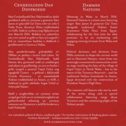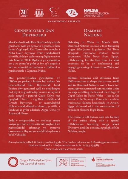 The Cenhedloedd Dan Ddyfroedd/Dammed Nations concert will feature solo sets by each of the participating artists along with a collaboration featuring contemporary folk songs about Tryweryn and the plight of the Nubian people in Egypt.