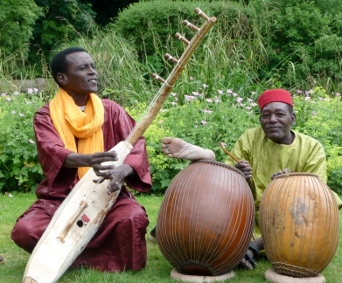 In May 2005, Malam Mamane Barka was invited to perform at the Desert Music Festival in Rissani, Morocco, which was the first time the biram had been taken outside its home country. The instrument was well received by the public, and more concerts abroad followed, including events in France and Germany. Thomas Brooman from WOMAD invited Mamane to perform at the UK festival in 2008, along with percussionist Oumarou Adamou, who was born the son of a Hausa griot in the city of Maradi, in southern Niger close to the Nigerian border. The two musicians had known each other for years, and decided to form the current ensemble in 2006. In July 2008, just after their successful appearance at WOMAD, the recording began at London’s Livingston Studios with producer Paul Borg. With Oumarou’s percussion this album is not only paying respect to the spiritual biram, but is also an homage to the traditional percussive instruments of the rich Nigerien culture: the douma (the spiritual drum), the kalangou and the calabash.
