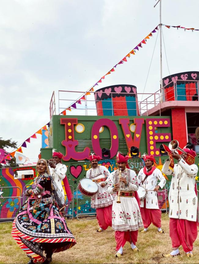 Bestival and Camp Bestival Dorset 2015 to 2019, Dorset and Shropshire in 2022, 2023, 2024 and in Dorset this year -taking genuine Bollywood music to Rob and Josie’s spectacular Bollywood Tent; leading wedding processions to the surprise of the happy couples and their guests; thrilling audiences of all ages; special guests at the opening night VIP parties.