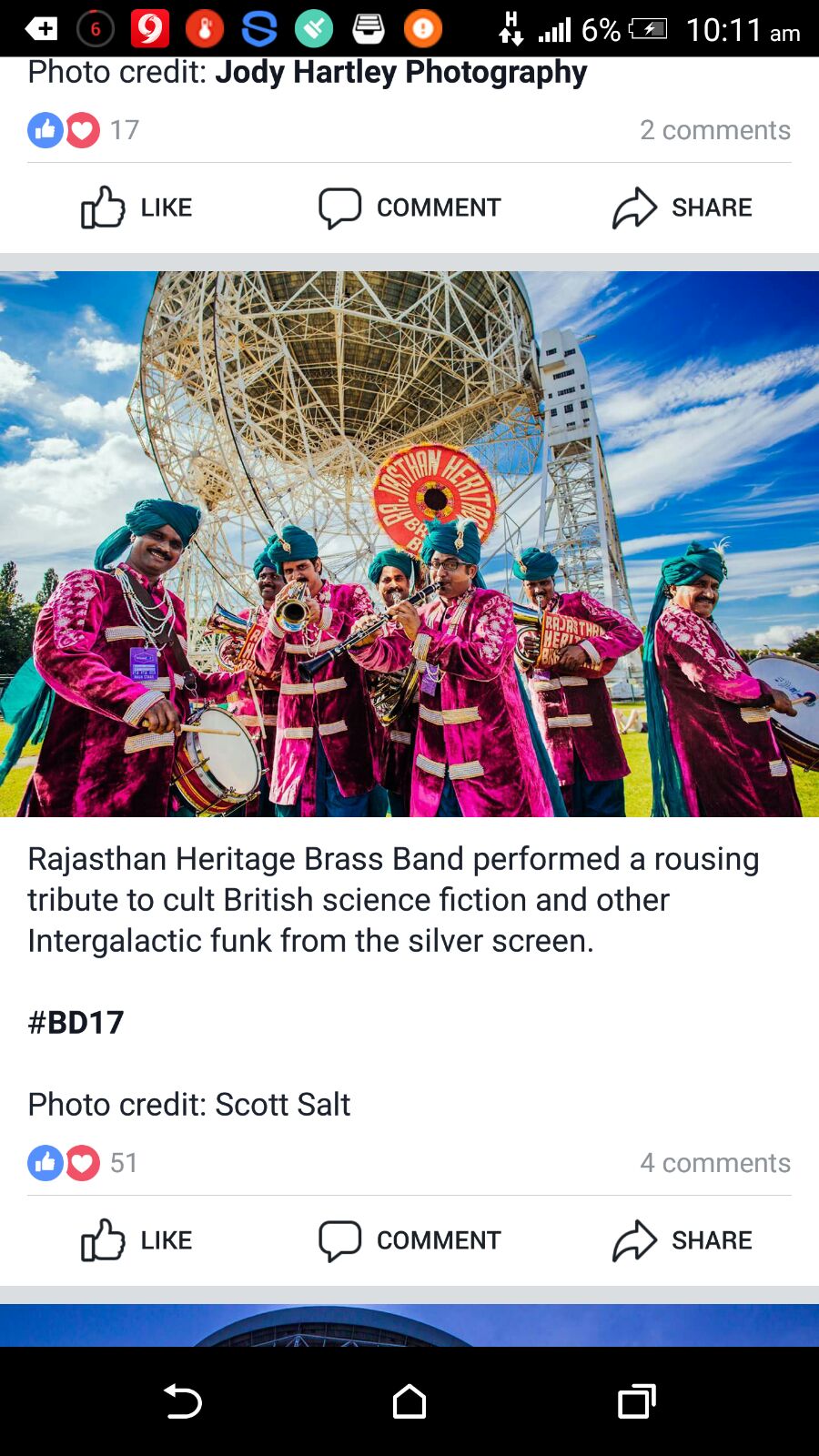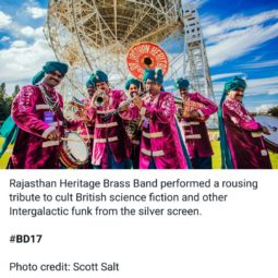 Bluedot. Performing a rousing tribute to cult British Science Fiction and other Intergalactic funk from the silver screen on the main stage at Jodrell Bank in both 2017 and 2018; in the Delia Derbyshire Tribute led by Dick Mills and the BBC Radiophonic Workshop where they played the Dr Who theme; The Man Behind the Mask talk with Dave Prowse, (AKA Darth Vader) and Brian Muir who made the mask, where they played the Star Wars theme; playing in the crowds around the iconic telescope and leading the parades in the main arena. Their impressive debut appearance in 2017 led to them being re-booked right away.